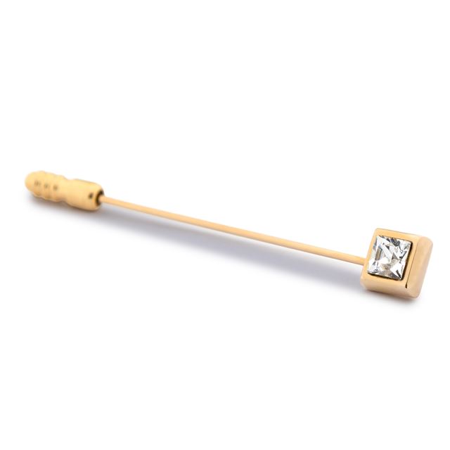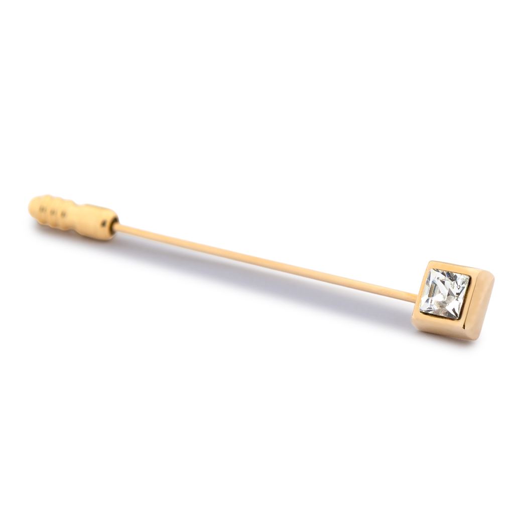 Articulo: pincho para corbatón bañado en rodio con cristal cuadrado. Color: plateado. Cierre: basculante, tipo americano. Material: latón de primer titulo con baño de rodio. Características: no se oxida, anti alérgico, nickel-free. Presentación: estuche con cierre de imán.